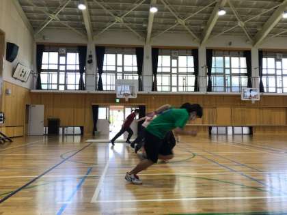 (しゃしん2)たおれこみダッシュです。しゅんぱつりょくと,からだのバランスやしせいをきたえるトレーニングです。いっぽんのぼうのように,からだをまっすぐにたおれこんでみてください。これいじょうたおれられない!とあしがでたしゅんかん,ダッシュです!!