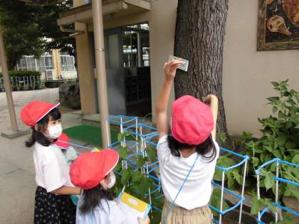 今日は前に観察した時とくらべてどんな変化が見られたかを観察しました。アサガオの観察名人が増えてきましたよ!つると背比べもしてみました。