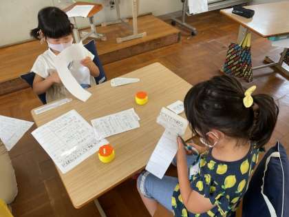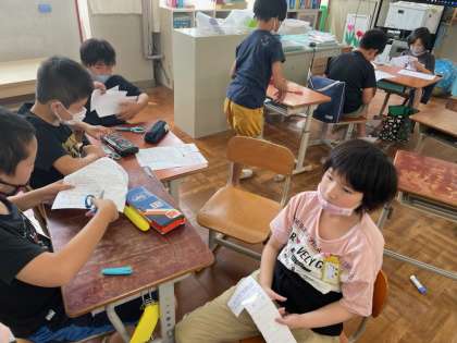 教職員の方々にアンケートをした結果を5組のみんなでまとめていきました。好きな食べ物・旅行に行くならどこなど,子どもたちが考えた質問の答えを見ながら切貼りをしました。完成まであと少し!自分の学年の先生たちの答えをわくわくした目で見ていました。
