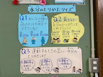 ☆今月のテーマは「水分の上手なとりかた」です。暑さも本格的になり,熱中症が心配になってきました。マスクをしていると,のどの渇きも感じにくいようです。