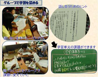 さまざまな意見の中でみんなが納得できるようにまとめていかなければならないのです。そこで、今回社会科の学習課題を設定する場面で、交流の仕方を台本のようにして話し合いがどのようになればうまくいくかを提示しました。