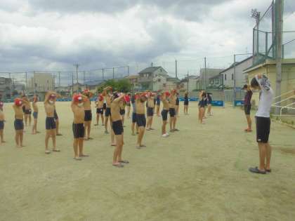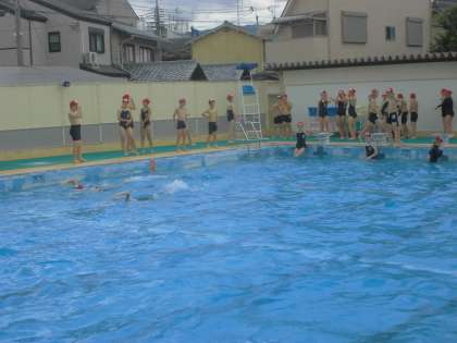 初回の学習では,今自分がどのくらい泳げるのか泳力を確認しながら泳いだり,いざという時に命を守るための延命泳法を確認したりしました。早速タイムを計る子も見られました。2クラスずつ,また明日からも学習を進めていきます。どんどん自分の泳力を高めてほしいと思います。