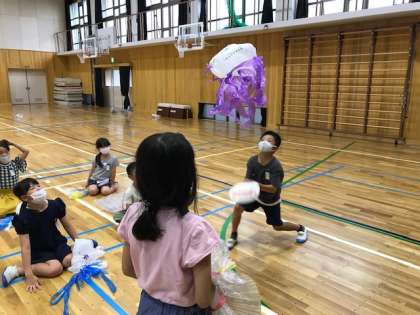 つくった作品が風にゆれる様子,ふくらんだりしぼんだりする様子を見ながら,子ども達はとても楽しんでいました。たくさんのテープをつけたり,ふくろの中にふくろを入れて工夫していた子ほど,重たくてなかなかうかない…というむずかしさもありましたが,みんなで必死にうちわであおぎました!袋やうちわなどのご準備,ありがとうございました。