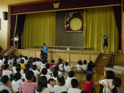運動会の自分のチームが,赤なのか白なのかは子どもたちには大きな問題です。色にジンクスが着いていたり,応援席の場所の好みがあったり,自分のお気に入りもあり,前年度の優勝チームというのもあって大きな関心事なのでしょう。そこで,今年は色の決定を全校児童の前で公開抽選をしました。Aチーム・Bチームの応援団長が出て,抽選箱から赤玉・白玉を引き当てます。そのあと応援団長が今年の優勝への決意を述べます。それほど大きな差があるとは思えないのですが,抽選会はとても盛り上がりました。