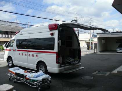 社会科の「安全なくらしを守る」学習の一環として,西京消防署の見学に行ってきました。救急隊の方が行われる応急処置の様子を見せていただいたり,「救急救命士」の方から,自分の命を守る工夫や大切さのお話をうかがったりしました。