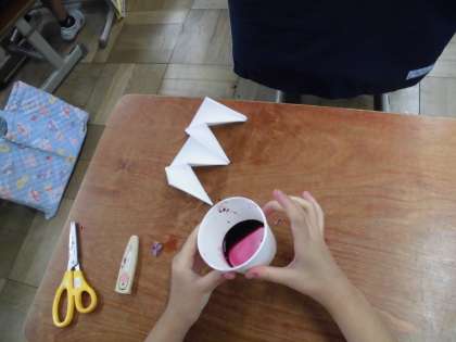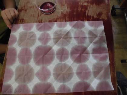 大切に育てたアサガオの花を使って色水を作りました。「ジュースみたい!」「きれいな色!」という声がたくさん聞こえてきました。次に和紙で折り染めに挑戦しました。染めた和紙を丁寧に開けていくとすてきな模様が表れて「わあー。」という歓声があがりました。保護者の皆様,夏休み中に冷凍保存していただきありがとうございました。