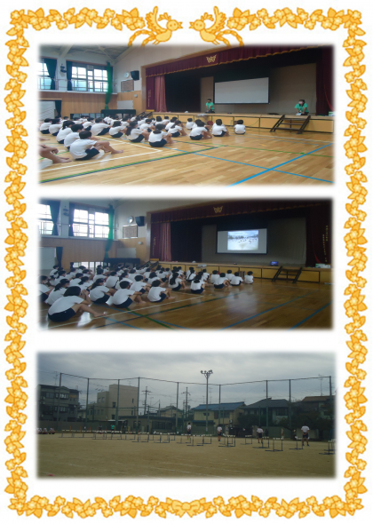 体育科参観授業の最後は,最高学年として6年生が務めました。本番のこの日に向けて,夏の学年集会から目標を話し合い,集団体操を立ち上げました。