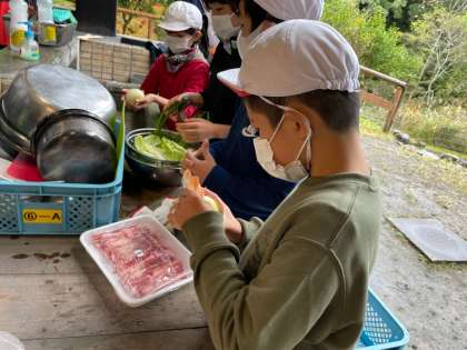 野外炊事が始まりました。水が冷たい中、しっかり手を洗い、下準備に取り掛かっています!