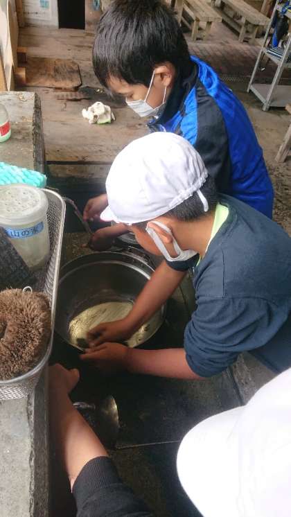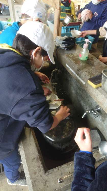 班の中で役割分担をして,食材を切ったり,かまどの準備をしたり,協力して活動を行いました。どの班もかまどに火をつけることに苦戦していましたが,何度も何度も薪を組みなおし,挑戦していましたが,そこには仲間と協力して活動している姿がありました。出来上がったすき焼き風煮を最高の笑顔で食べている子どもたちが印象的でした。後片付けも協力して頑張っています。