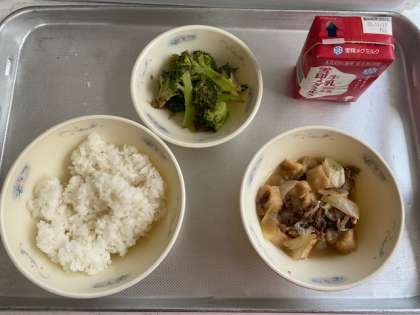 ☆今日の給食は,全校で残しがとても少なく,「ブロッコリー大すき!」と,低学年のみなさんにも大人気でした。すき焼き風煮のあまからい味付けでごはもすすんでいました。