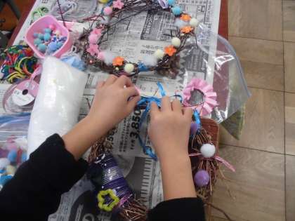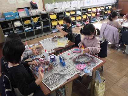 大切に育ててきたアサガオのつるを使ってリースを作りました。いろいろな材料を工夫して飾りつけをしました。すてきなリースが完成しました!
