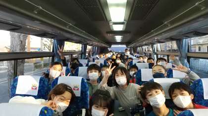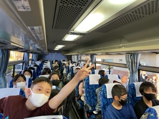 元気いっぱいの子どもたちを乗せたバスが走り出しました。最初の目的地は北淡震災記念公園です。途中,明石海峡大橋に寄ります。楽しくて仕方ない表情の子どもたち。素敵な旅の始まりです。