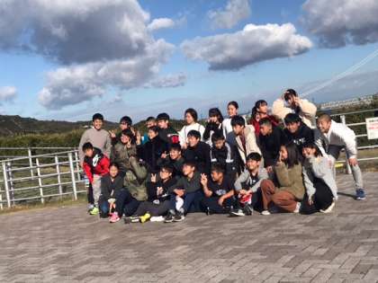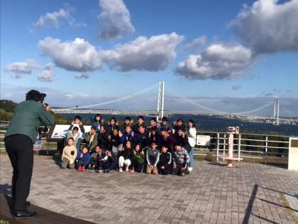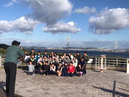 明石海峡大橋に到着しました。クラスごとに写真撮影です。海風は冷たいですが子どもたちは元気いっぱいです。