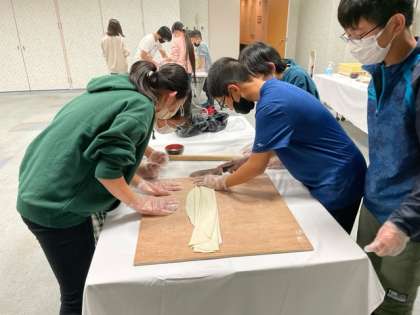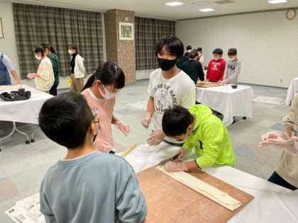 頑張ってのばした「うどんの生地」を切り始めました。グループによって形が違い、なかなかユニークな形の生地も(笑)