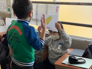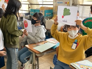 今日はみんなで八百屋さんになって、野菜を売ったり買ったりしました。