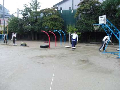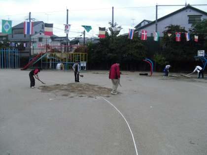 15日 6:00に体育部の先生方が集まり,水がたまっているところに土を入れたり,ブラシをかけたり,開催の可能性を探っています。