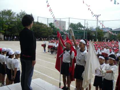 校長先生は,東日本大震災の被害にふれ,今年も運動会ができることに「感謝」し,全校で協力して今日1日よい運動会にしましょう。と話されました。交流児童の紹介も行われました。