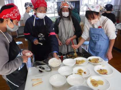 野菜のベーコン巻き,豆腐と野菜のチャンプルー,ベーコンポテトの中から好きなメニューを選び,自分たちで材料をアレンジして調理しました。どの野菜から茹でるのかな,お湯はどれくらい必要?どんな切り方だっけ?そんな声があちらこちらから聞こえてきました。みんな休み時間も忘れるぐらい楽しみながら夢中で調理していました。