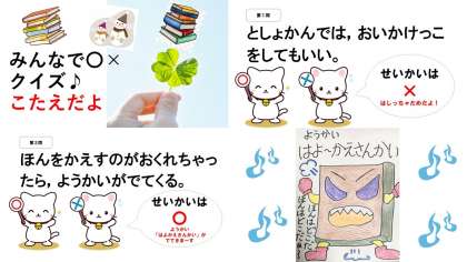 みんなのもとにあらわれるまえに,よんだほんはずっともっておかずに,はやめにとしょかんにかえしにいきましょうね・・・!