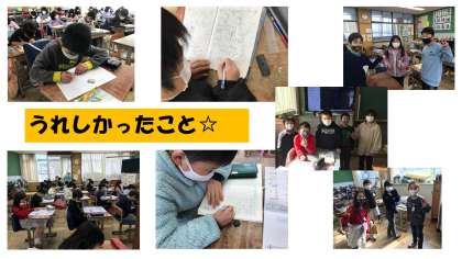 今日,うれしかったことは,休んでいた人が来てくれたことです。なぜかというと,なかなか会えなかったり,話したりできなかったので,話したいことが言えてよかったです。明日,みんなが学校に来れるといいなと思います。