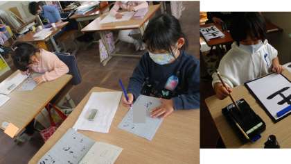 水をつけた筆で書くと 紙の色がかわるのが面白くて