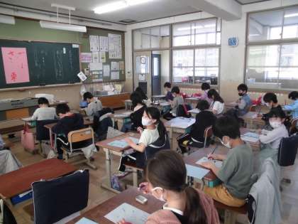 書写の文字の学習で初めて水書に挑戦しました。書いた文字が消えて何回も書けるのが不思議でいろいろな字の練習をしました。筆で書くのは力加減が難しいですね。