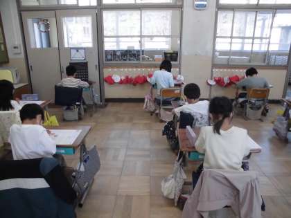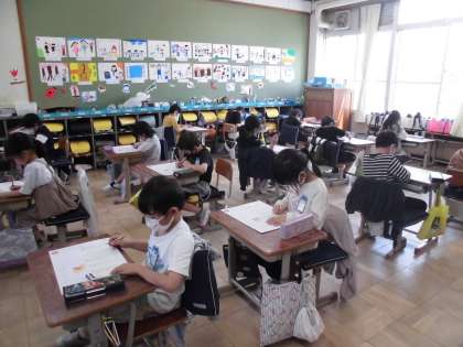 今日は1年生最後の国語のテストをしました。テストにも慣れて,問題文を真剣に読んで答えようとしていますね。
