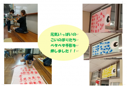 こいのぼりたちに,みんなの手形でうろこを描きました。