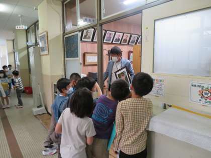 桂東小学校のことをよくしってもらうために,1年生と学校たんけんへ行きました。今日まで,教室の看板をつくったり,学校紹介の練習をしたり頑張ってきました。始まる前はちょっぴりどきどきしていた2年生。