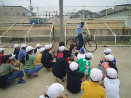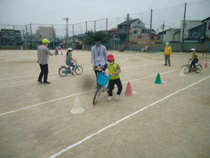 今日,4年生は警察署の方や地域の方にお世話になり自転車教室を行いました。安全に乗る方法や,交通ルールについて警察の方からお話を聞き,実際に自転車に乗って確かめました。
