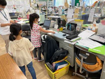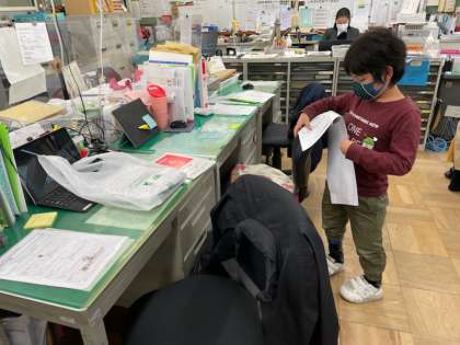 わくわく大作戦で作ったアンケートを配布に行きました。交流クラスの先生はもちろん,調理員さんやALTの先生たちの机を探しながら置いていきました。