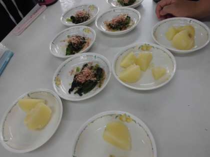 グループでほうれん草とゆでいもの2つにわかれて協力しながら作りました。包丁やピーラー,まな板などの調理器具の扱い方もきちんと理解することができました。