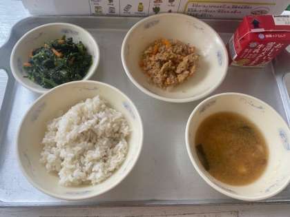 今日の給食は,麦ごはん,みょうがのみそ汁,おからツナ丼の具,ほうれん草のごま煮,牛乳でした。