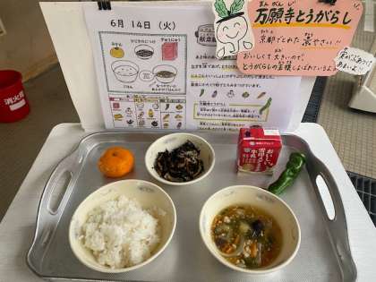 今日の給食は,ごはん,夏野菜のあんかけごはん,ひじきの煮つけ,牛乳,冷凍みかんでした。