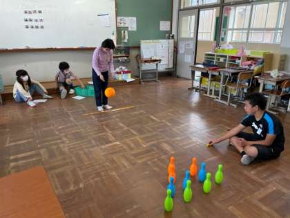 5組の算数で『得点ゲーム』をしてきました。ボーリングやなげあそび・魚釣りなどをしながら,自分の得点を数えていき,計算が合っているかの確かめをグループで行っています。