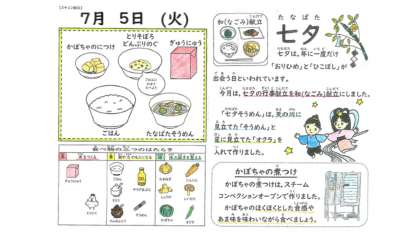 献立は、ごはん、鶏そぼろ丼の具、七夕そうめん、かぼちゃの煮つけ、牛乳でした。