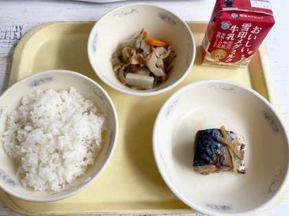 今日の給食は、ごはん、さばのしょうが煮、あいまぜ、牛乳でした。