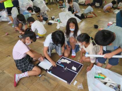 身近な材料を使って遊びを考えている子ども達。どの子も新しい遊びを発見して楽しそうに活動しています。
