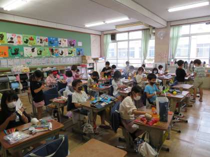 ストローと紙コップを使って動く仕組みをつくりました。たくさん動かして遊び,動きに合うかたちを見つけ,飾りつけをしていきます。材料のご準備ありがとうございました。