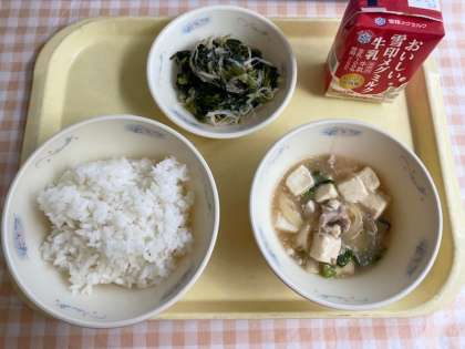 今日の給食は、ごはん、五目どうふ、ほうれん草ともやしのいためナムル、牛乳でした。