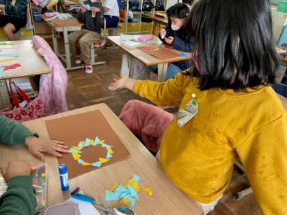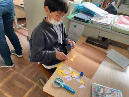 「どんな風に貼ろうかなー?」「こっちに向けてたら素敵じゃない?」など。子どもたち同士でいいところを見せあいっこしながら作っていきました。教室の後ろに貼るのが楽しみです☆