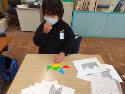 算数科の学習で三角形を組み合わせていろいろなかたちを作っています。今日は、みんなが考えた形をシルエットクイズにして解き合いました。同じ形でも三角形の組み合わせ方はいくつかあることに気づき、自分が考えやすい形を見つけ、シルエットクイズに取り組みました。