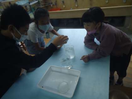 初めての理科室での学習や実験に少しドキドキしながらも、理科室での学習の約束を守って真剣に実験する姿が見られました。