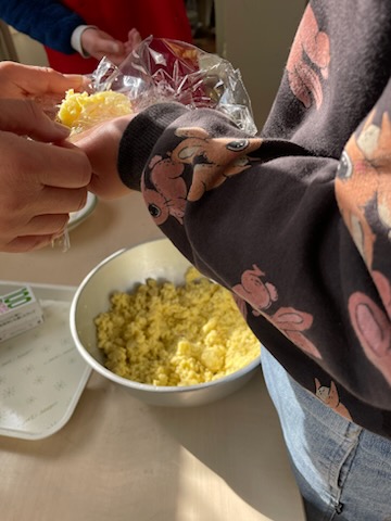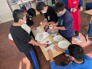 2学期最後の日は、さつまいもで茶巾絞りをつくりました。前半はさつまいもを切る、むく、つぶす工程を。後半はラップで形を整えていきました。ほんのり甘く、「おいしい!」「おかわりはある?」と喜んでいました。