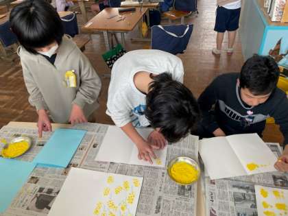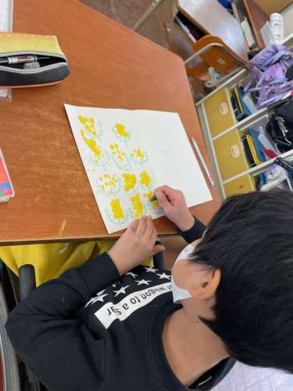 3月のカレンダーを作るため、ミモザの花を描いていきました。黄色い絵の具を指先につけて、「トントン楽しい!」と小さな花をたくさん咲かせていきました。