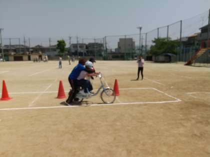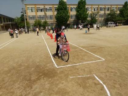 警察の方から交通ルールについてのお話の後、各クラスごとに運動場で自転車の乗り方を確認しました。警察やボランティアの方々から応援やご指導をいただき、子どもたちも一生懸命取り組みました。