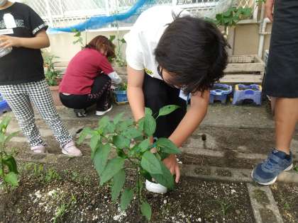オクラやピーマン、とうがらしといった野菜を収穫しました。