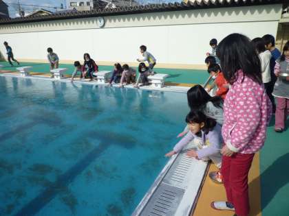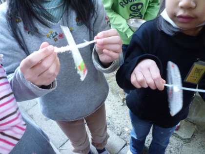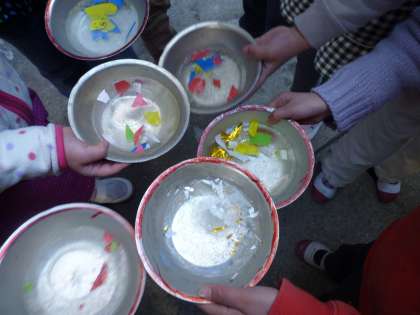 2月3日は寒い朝でした。水をいれて前の日から用意していた食器に,氷ができました。楽しみにしていたので,大喜びでした。氷をさわったりとかしたり氷でいっぱい遊びました。プールも全面凍っていました。