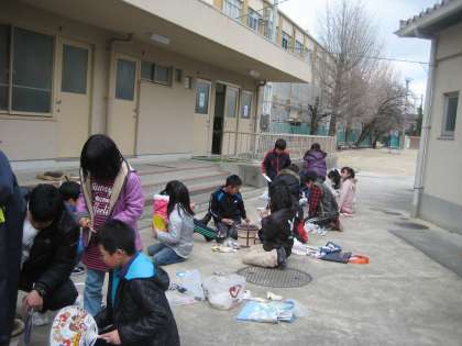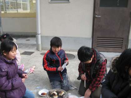 七輪に新聞紙・わりばし・炭の順番に入れ火をつけて,うちわであおぎます。子どもたちは,一生縣命にうちわであおぎますが,なかなか炭には火がつきません。便利な生活に慣れている子どもたちです。ずいぶん苦労しましたが,ようやくお餅が焼けるようになった時は,歓声があがっていました。