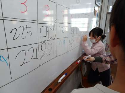 この前5組の畑で収穫したサツマイモを使って、重さの学習を進めています。